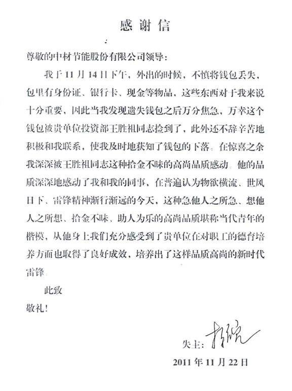 拾金不昧是中華民族的傳統(tǒng)美德,也是一個人所具備高尚品質和崇高社會責任感的具體體現(xiàn)。2011年11月14日下午,我公司投資部的投資經理王勝祖在天津出差時拾到一個錢包,內有身份證、現(xiàn)金、銀行卡等重要物品。經王勝祖多方查找,最終和失主李京皖先生取得聯(lián)系,并將錢包物歸原主。失主李先生看到自己的錢包失而復得時,當即拿出200元表示感謝卻被王勝祖婉言拒絕。