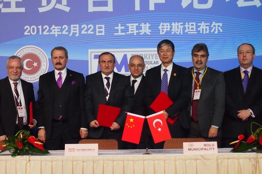 中材集團(tuán)董事長(zhǎng)譚仲明率團(tuán)與來(lái)自中土兩國(guó)的企業(yè)家和各界人士500多人出席論壇。期間,譚仲明與BOLU市長(zhǎng)Alaaddin Yilmaz分別代表中材集團(tuán)及土耳其BOLU市政府簽署了合作框架協(xié)議。中國(guó)商務(wù)部國(guó)際貿(mào)易談判代表兼副部長(zhǎng)高虎城及土耳其經(jīng)濟(jì)部長(zhǎng)恰拉揚(yáng)等見(jiàn)證了簽約。