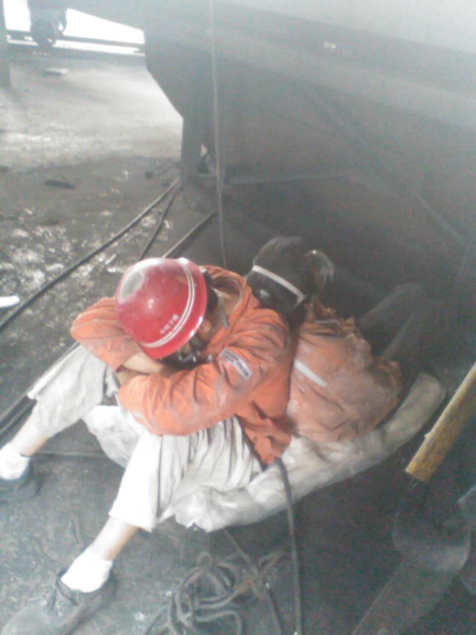 在高溫下連續(xù)作戰(zhàn)二十幾個(gè)小時(shí),他們已經(jīng)筋疲力盡,實(shí)在太困了,就在換班的間隙,互相依偎睡著了……