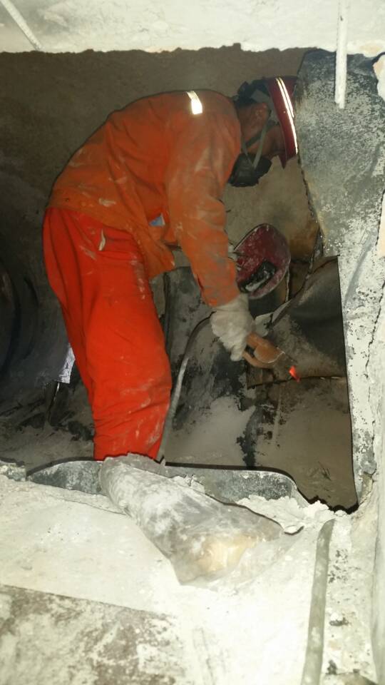 全廠沒有電源,意味著硅業(yè)收塵車間的引風(fēng)機(jī)也停運(yùn),清灰工作就要在高溫且無(wú)負(fù)壓的條件下進(jìn)行,煙道內(nèi)的溫度達(dá)到70多度,向外噴熱煙塵,加上澆注料的熱輻射,進(jìn)入煙道立刻汗流浹背。此種作業(yè)環(huán)境,在員工心里和生理上都是一項(xiàng)巨大的挑戰(zhàn)。更具挑戰(zhàn)性的是5#鍋爐割除不銹鋼板的工作,煙道內(nèi)的電焊操作人員,需把不銹鋼板割成小于50cm的小塊,然后一塊一塊地從人孔門遞出。在此高溫環(huán)境下作業(yè),每個(gè)操作員只能堅(jiān)持十幾分鐘,輪流上陣。長(zhǎng)時(shí)間的焊割作業(yè),使每個(gè)人的面部都被烤的紅腫,疼痛。面對(duì)挑戰(zhàn),中材節(jié)能人沒有退縮,而是爭(zhēng)分奪秒奮勇作戰(zhàn)。換班的間隙,許多員工兄弟們累得背靠背都能入睡。在中材節(jié)能龍陵子公司員工努力下,持續(xù)作戰(zhàn)二十個(gè)小時(shí),如期完成檢修,全力保障運(yùn)營(yíng),展現(xiàn)了中材節(jié)能人的責(zé)任、力量與風(fēng)采。
