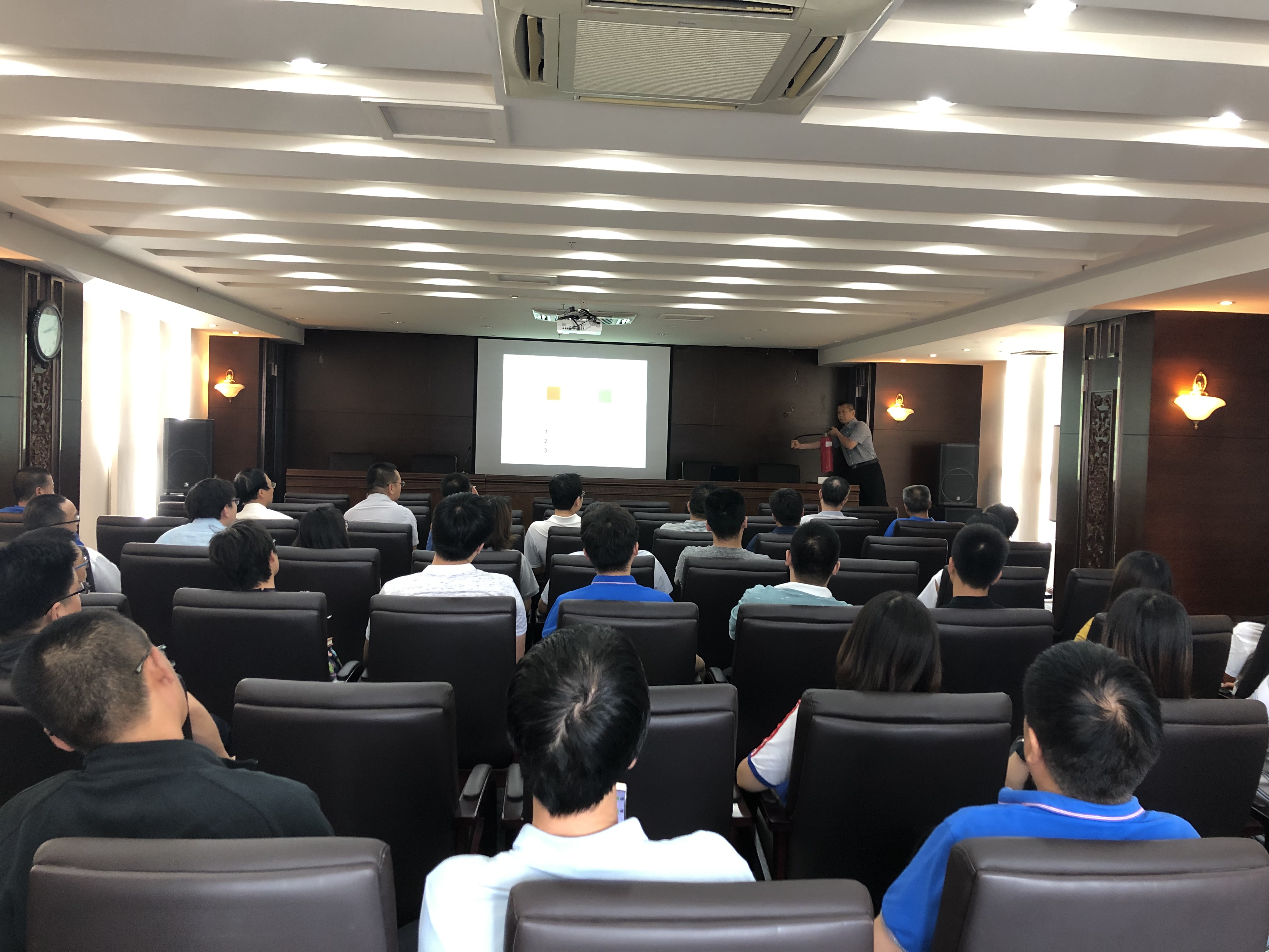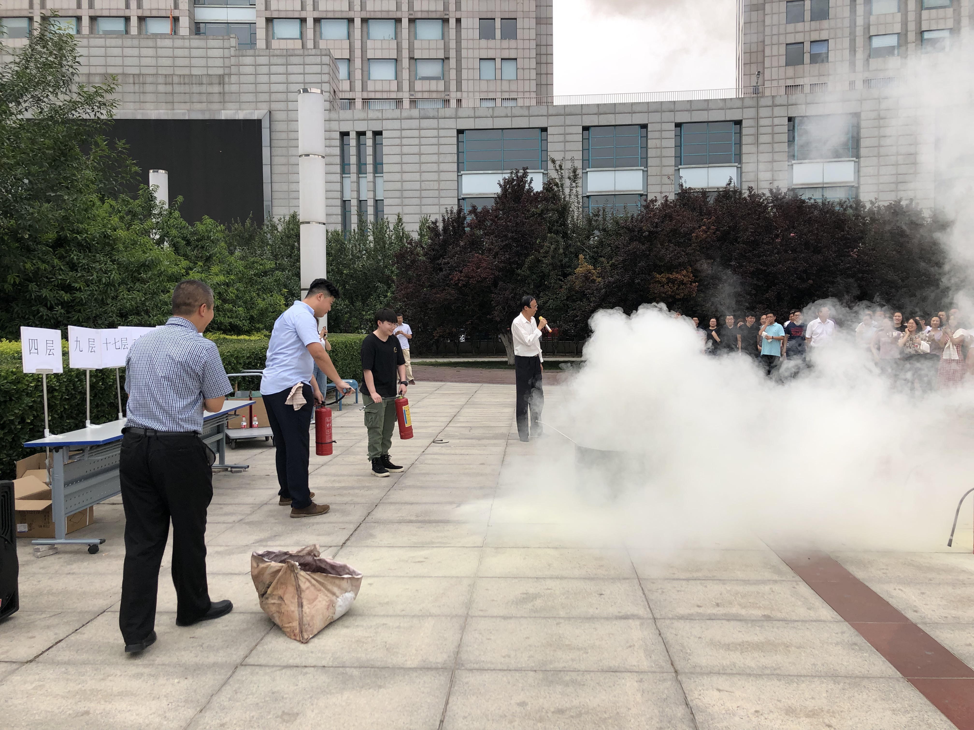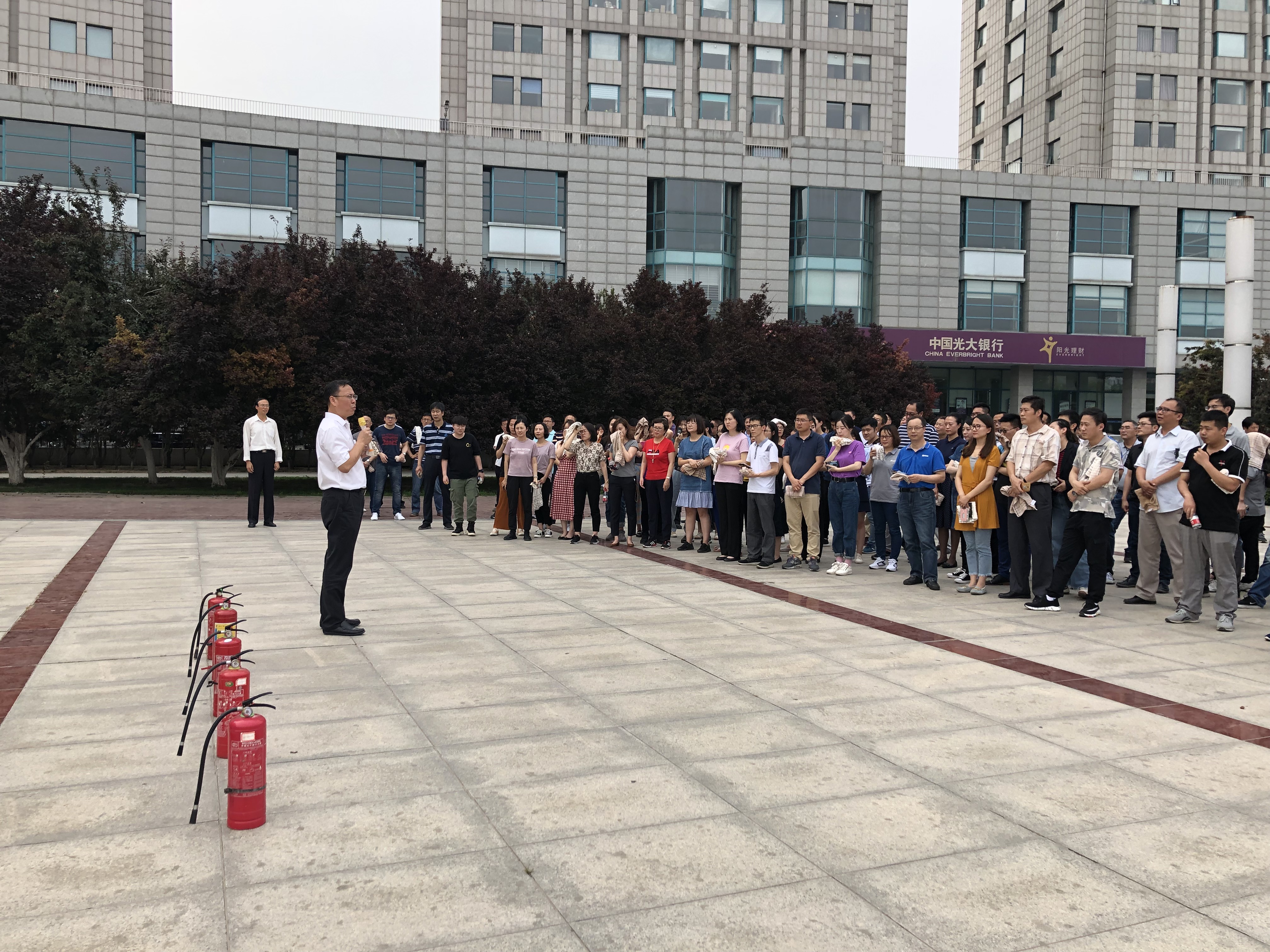 講座結(jié)束后,公司開展了辦公樓疏散演練。演練從15:28分警報(bào)響起到員工從辦公樓疏散到緊急集合點(diǎn)簽到完畢,歷時(shí)10分28秒,共191人撤離,整個(gè)撤離演練過程緊張有序,取得了預(yù)期效果。疏散演練后,公司總裁胡也明對(duì)此次消防疏散演練進(jìn)行了總結(jié)。他特別強(qiáng)調(diào)安全是每個(gè)人的責(zé)任以及應(yīng)急演練的重要性,并挑選了檔案室、機(jī)房、財(cái)務(wù)等相關(guān)部門人員進(jìn)行了滅火器實(shí)操演練。